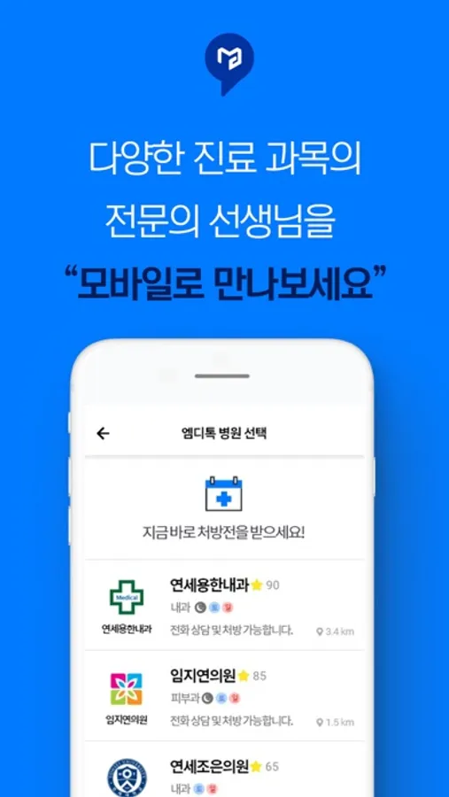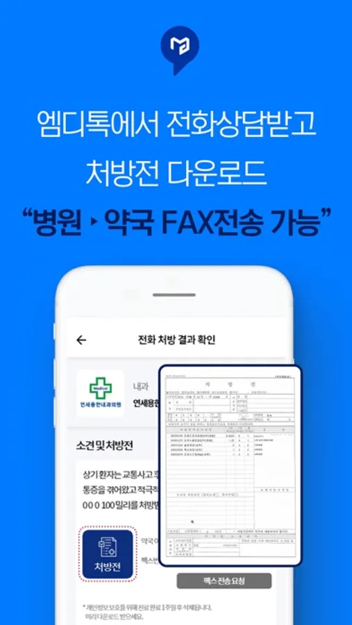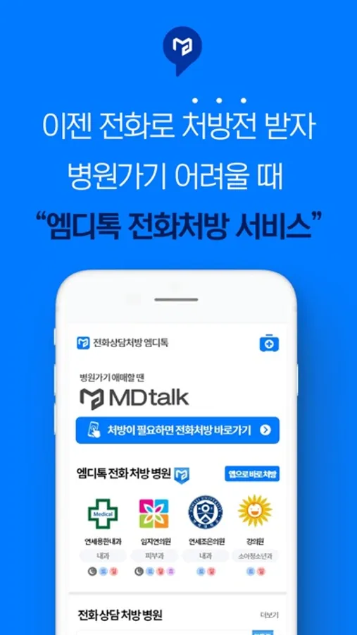 정부가 허용한 비대면 진료 전화 처방. 이제 엠디톡으로 집에서 편하게 전화상담 받고, 처방전을 받아 보세요. 언제 어디서나 의사 선생님과 모바일로 만날 수 있습니다.