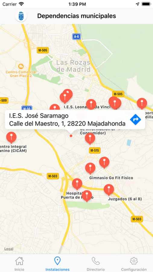 Localiza las infraestructuras más relevantes de la Administración. El Auditorio Municipal, la Escuela Infantil Talín, El Centro de Salud Cerro del Aire, el Registro Civil… todo aparece en el mapa. La APP conecta con tu navegador y te lleva donde quieras ir.