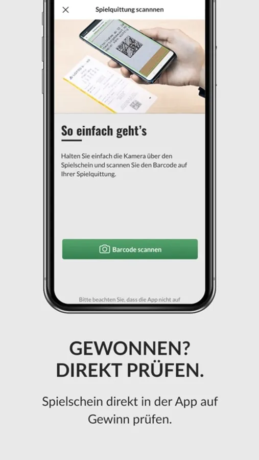 Erfahren Sie sofort, ob Sie gewonnen haben: Gewinne auf online abgegebene Tipps werden direkt in der App angezeigt, auf Wunsch erhalten Sie auch eine Gewinnbenachrichtigung. Auch klassische Spielquittungen können Sie ganz einfach prüfen: Einfach den Barcode auf der Spielquittung einscannen und Sie erhalten sofort eine Auswertung Ihrer Tipps.