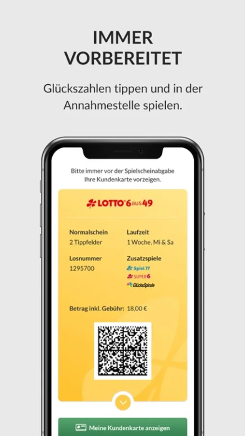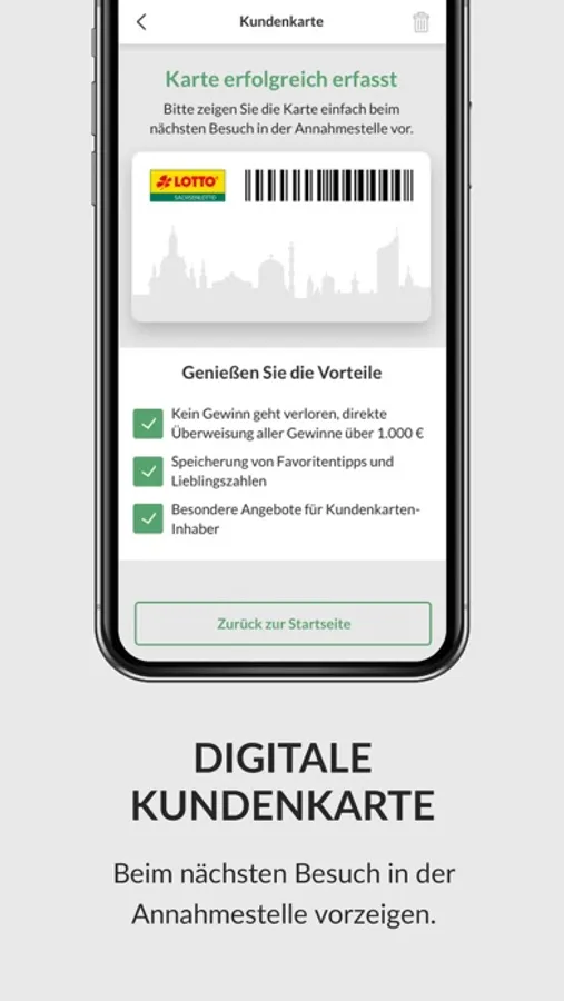 Sie möchten Ihre Tipps lieber in einer Sachsenlotto-Annahmestelle abgeben? Mit der Sachsenlotto-App können Sie Ihren Spielschein bequem und digital unterwegs ausfüllen und anschließend in einer Annahmestelle abgeben. Zeigen Sie dazu einfach den Barcode vor und Sie erhalten wie gewohnt Ihre Spielquittung. Zudem können Sie Ihre Sachsenlotto-Kundenkarte mit der App einscannen. Ihre digitale Kundenkarte haben Sie dann immer dabei – einfach wie gewohnt in der Annahmestelle vorzeigen.