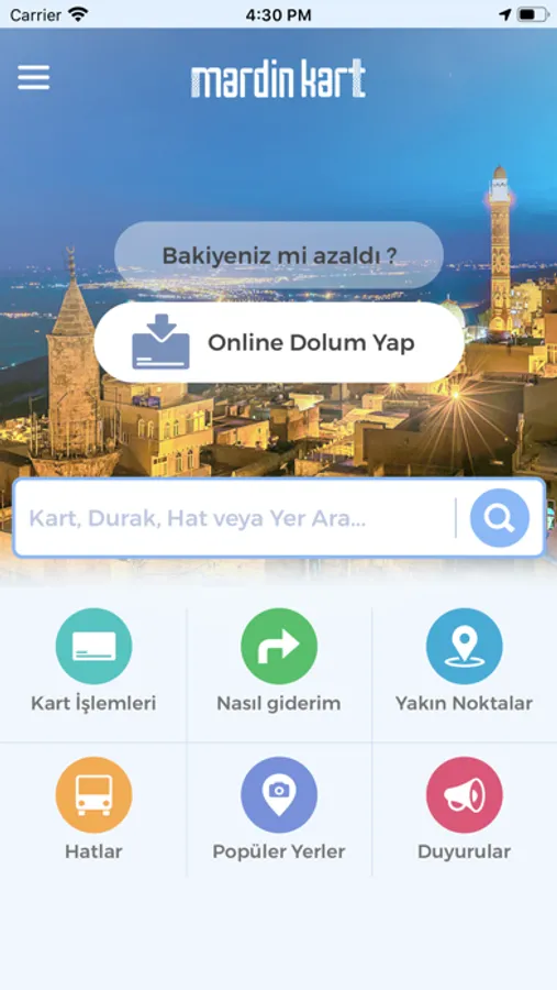 Mardin kentine daha kaliteli bir hizmet sağlamak üzere sunduğumuz Mardin Kart uygulaması ile şehir içi ulaşımda kendi rotanızı çizebilir, Mardin Kart 'ınızın kullanım geçmişini izleyebilir, beklediğiniz aracın geliş saatini görebilir, araç hareket saatlerini takip edebilir, kartınıza online bakiye yükleyebilirsiniz. Bayiden yükleme yapmak isterseniz en yakın bayi bilgisini uygulamadan alabilirsiniz.