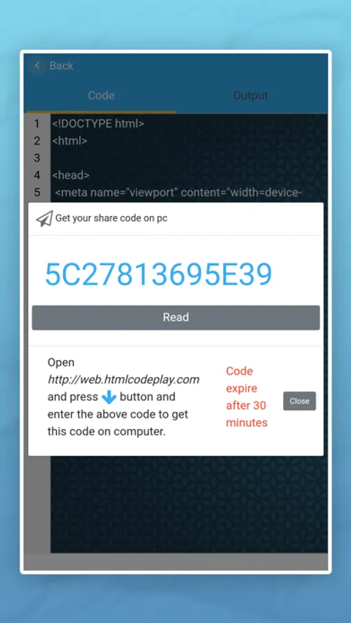 c) Then open http://web.htmlcodeplay.com website in a PC browser and press the "GET" icon, it will pop up a text box, in the text box enter the code which is shown in your mobile.