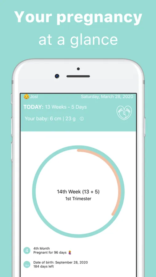 This free app shows you the progress of your pregnancy at a glance. The pie chart shows you your current week of pregnancy and you can see how many days you are already pregnant. In addition, we show you the current trimester and in the countdown how many days are left until your baby is born.
