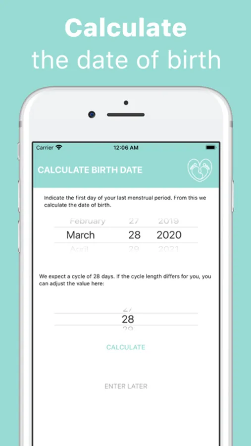 Simply enter your expected date of birth at the start of the app or use our date of birth calculator. This is used to calculate your baby's date of birth based on the time and duration of your last period according to the extended Naegele rule.