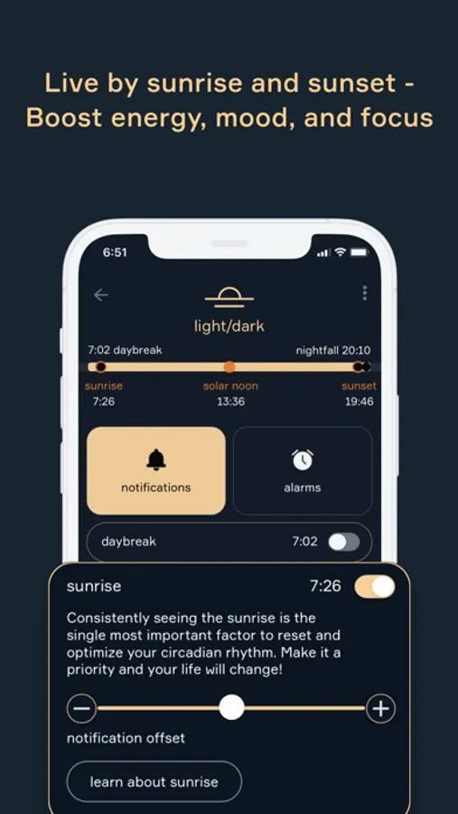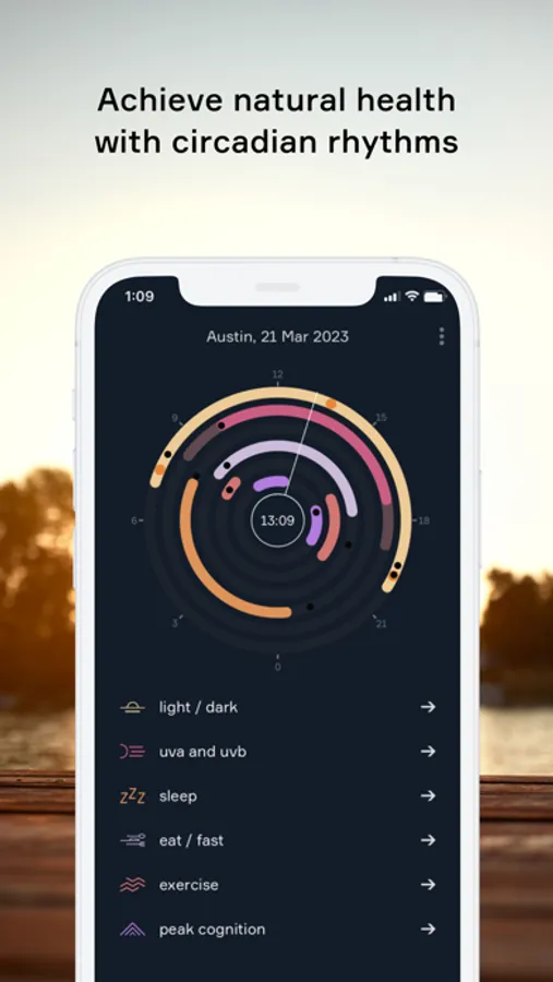 Artificial light or "junk light" is the main culprit for circadian disruptions. Which is why more natural light exposure, especially at sunrise and sunset, is crucial to reset and tune your biorhythm. Learn more in the app.