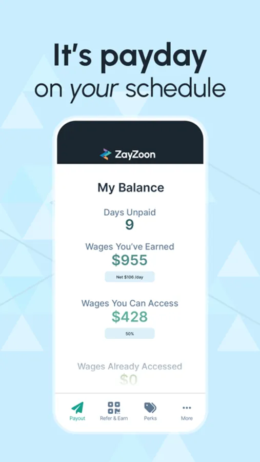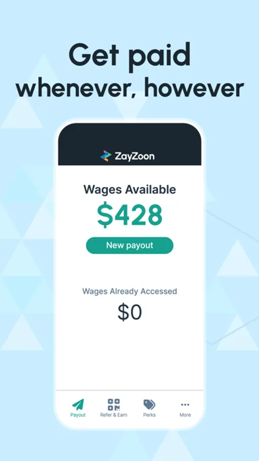 Make today the new payday. How it works: Each day you work, you build up an available amount and can choose how much of your wages you’d like to receive, instantly! On your payday, you are paid normally, minus the amount you accessed early.