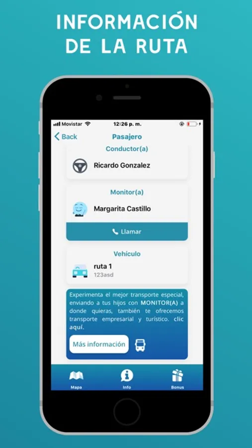Disponibilidad de información del bus tal como: Datos del conductor, monitora, datos del vehículo, así como sus números de contacto.