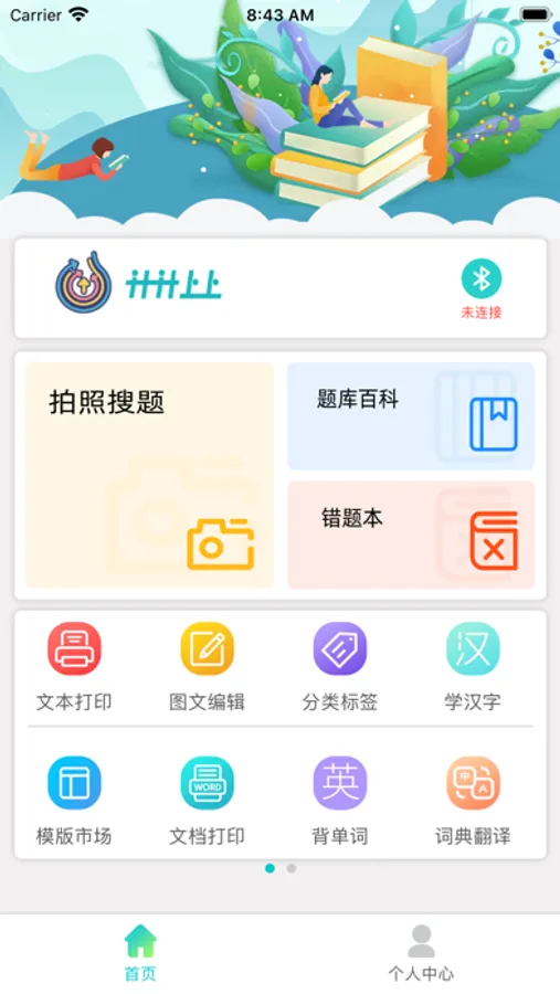 应用上上机机建立连接,可以通过拍照搜题,图文编辑等功能打印。