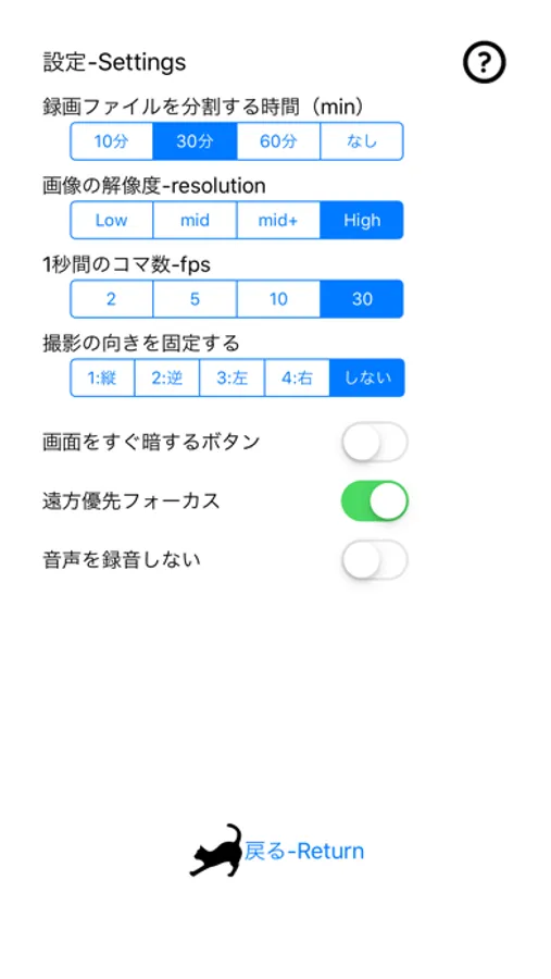 録画を開始すると一定時間で画面の照度を下げます。画面を1回タップすると明るさが一定時間戻ります。ダブルタップすると録画を停止します。