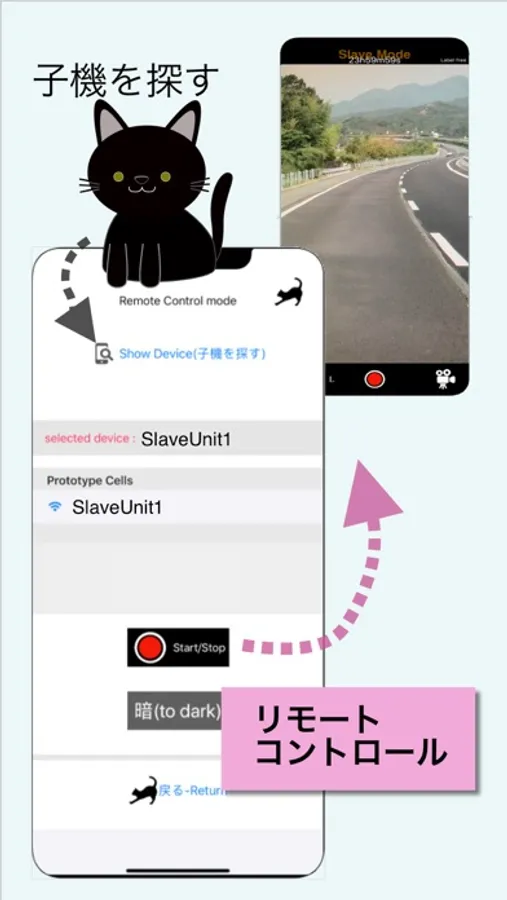 ・子機として設定したデバイスをリモートで操作できます。操作は、録画のStart/Stopと録画中に画面を暗くする事ができます。