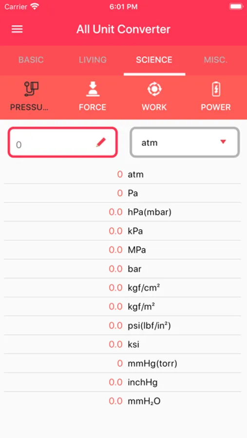 atm, Pa, hPa(mbar), kPa, MPa, bar, kgf/cm², kgf/m², psi(lbf/in²), ksi, mmHg(torr), inchHg, mmH2O, cmH2O, inchH2O