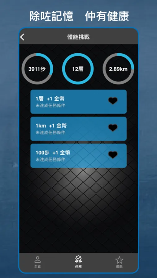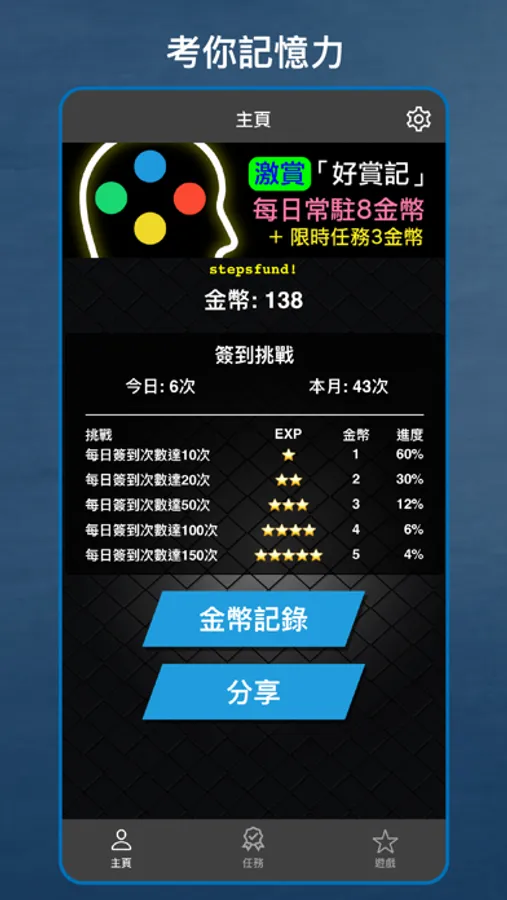 日常除咗做運動外,唔好忘記同個腦做吓訓練。「好賞記」提供小遊戲,同時訓練體能及腦記憶。遊戲玩法好簡單,每日按照iOS內建健康程式,以步數、距離或樓梯完成指定運動任務,即可以挑戰記憶遊戲,成功挑戰可以獲得遊戲金幣。此外,為加強娛樂及資訊性,亦會設排行榜,顯示挑戰次數、得分等數據。