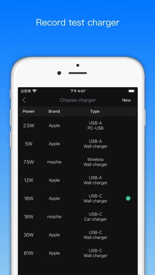 7. Support to add custom charger model, power, brand and interface.