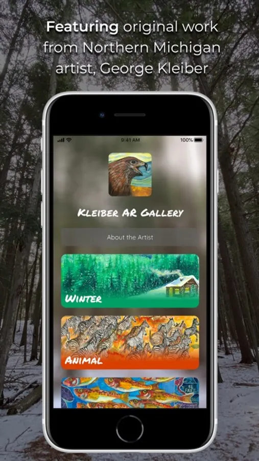 The Kleiber AR Gallery app showcases the captivating paintings of Northern Michigan artist, George Kleiber. In this interactive, augmented reality art gallery format, users are immersed in virtual exhibits and can walk right up to the artwork.