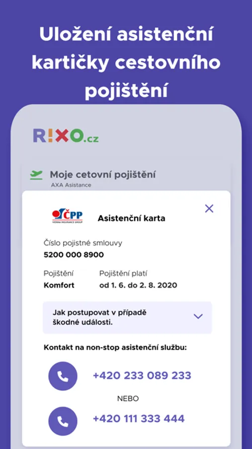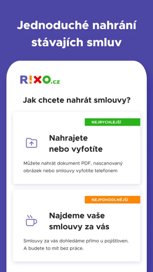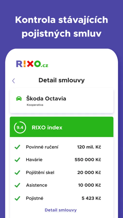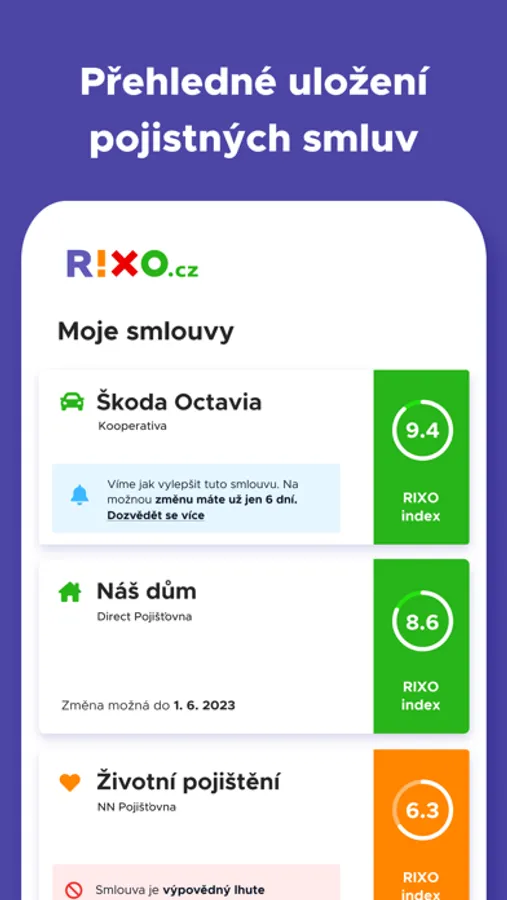 Pokud si pojištění sjednáte, pojistku si můžete uložit do svého RIXO účtu. Navíc ji jednou ročně sami od sebe zkontrolujeme. Pokud existuje výhodnější a levnější varianta, upozorníme vás na ni. Appka obsahuje i generátor výpovědí smluv pro případ, že se rozhodnete pojišťovnu změnit.