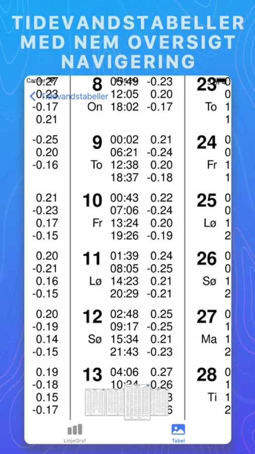 Tidevandsgrafer over Danske Farvande med ca. 4.6 millioner datapunkter for året 2023 med nem dato navigation for at nemt finde din ønsket data