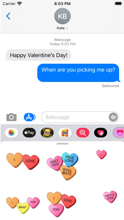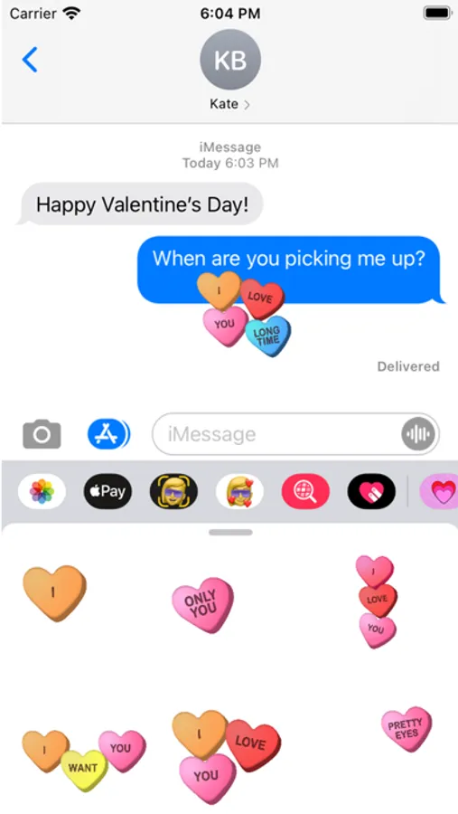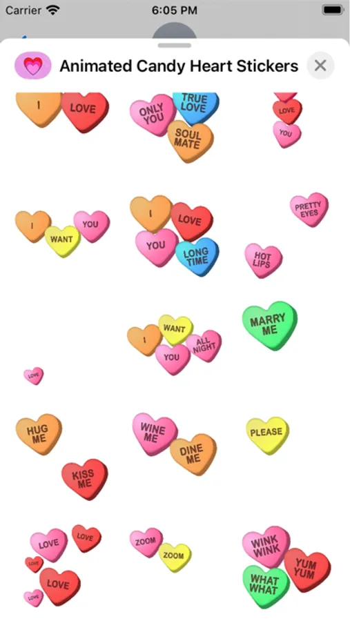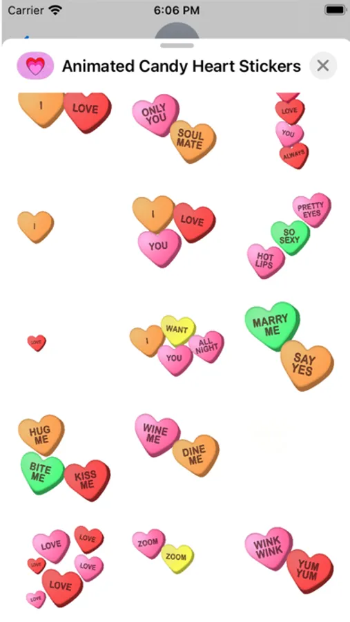 Animated candy heart stickers that spell out fun and flirty phrases to send to your loved ones or that special someone Valentine’s Day! Over a dozen stickers!