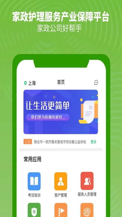 5.考试培训:提供专业技能培训及认证平台,为每一个家庭服务人员有技能;