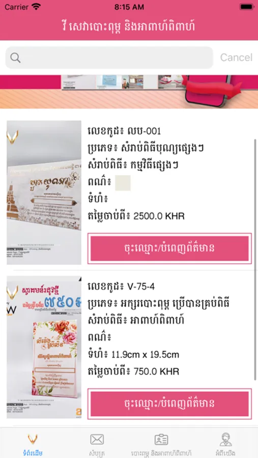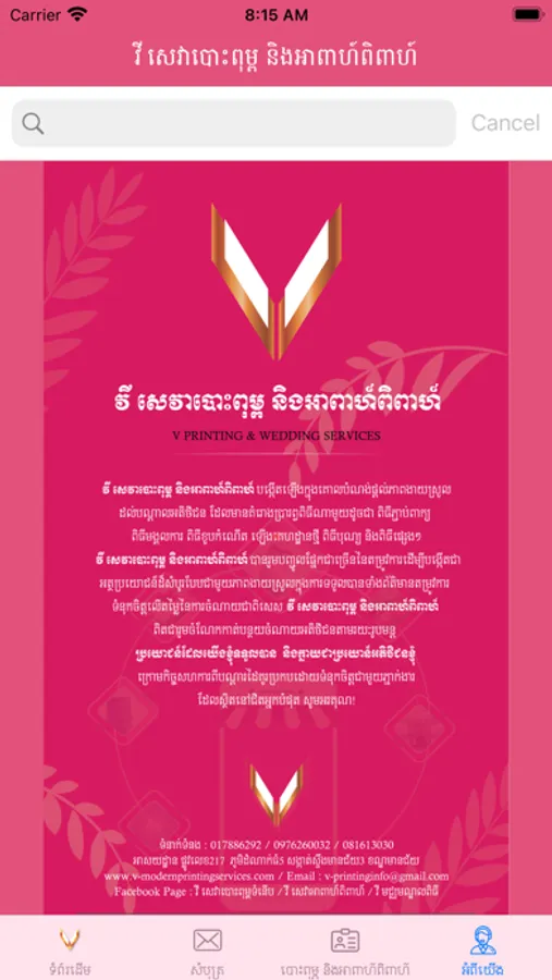 V Modern Printing Services App provides a facility for clients in Cambodia to browse the existing services from V-Modern Printing Service Shop including Wedding Invitation Notes Letter, Ceremony Invitation Letter, Business Cards, etc. with its price. Clients can use this app to submit an order and will get response from the service provider via phone or other social network connection.