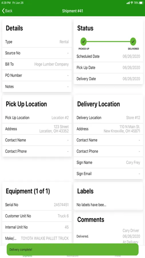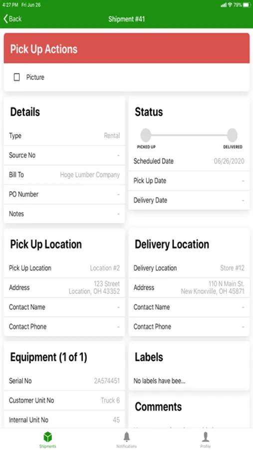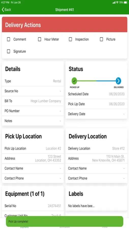 Ship iT allows drivers to obtain the following information and automatically generate shipping documents for the pick up and delivery of equipment. These include: