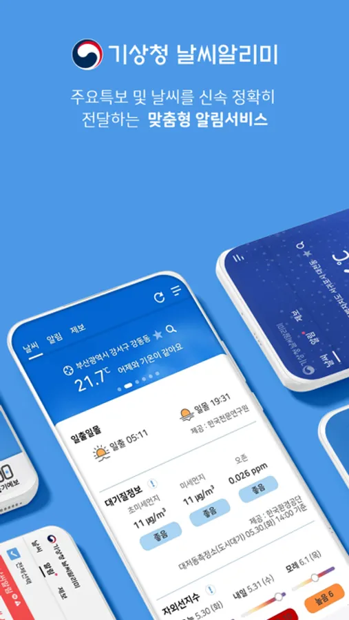 기상청에서 직접 제공하는 날씨알리미는 지진, 기상특보 등의 위험기상정보를 사용자 위치기반으로 알려주는 맞춤형 알림서비스입니다.