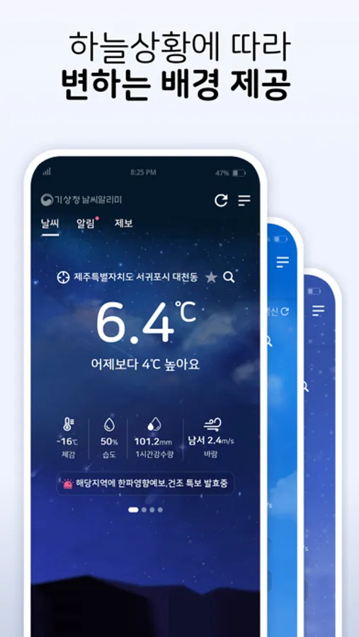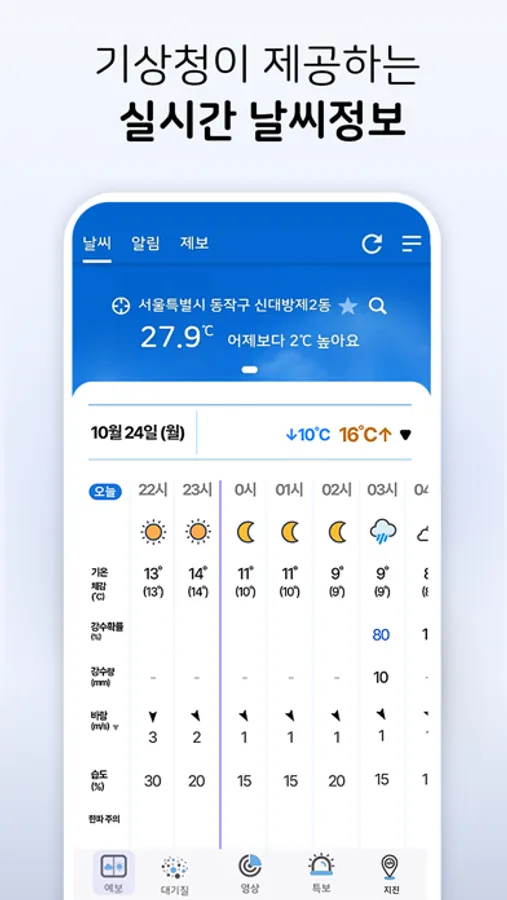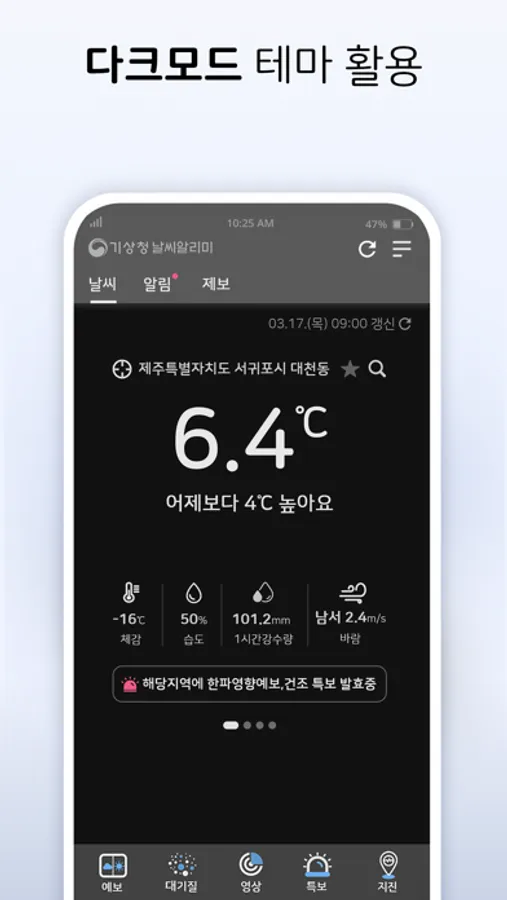 앱 실행 시 내가 원하는 지역의 날씨상황을 한 눈에 볼 수 있고 지진, 기상특보 등 위험기상 알림시 알림정보를 바로 확인할 수 있습니다.