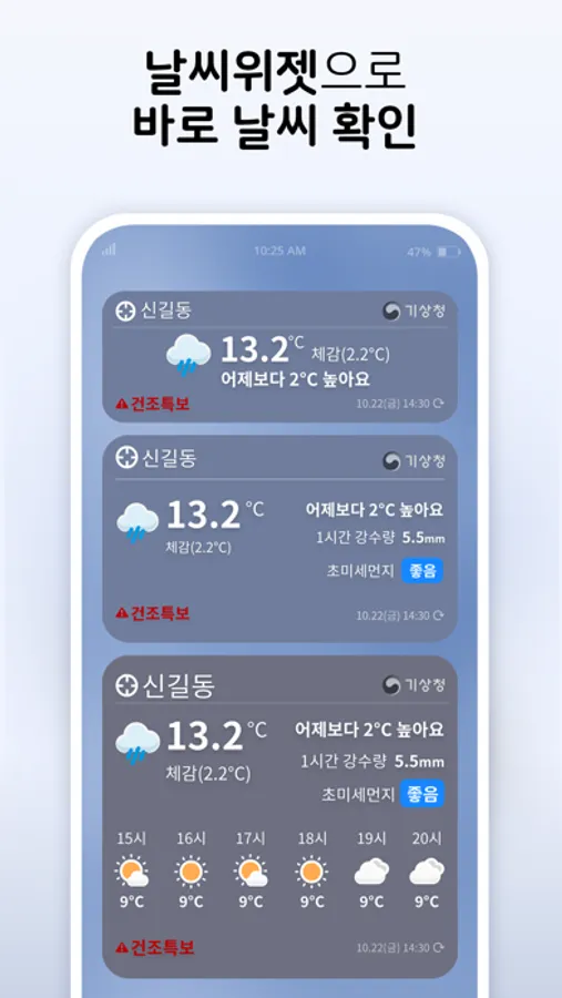 폰 화면에서 간편하게 날씨확인이 가능한 날씨위젯 기능을 제공합니다.