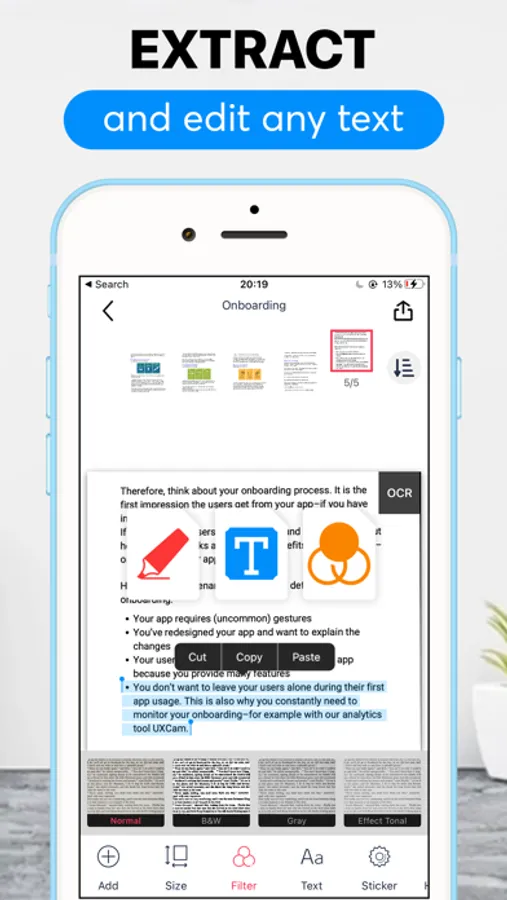 In addition, easily convert photos to texts with OCR function. Extract text from a scanned document and edit it as you desire. This powerful text scanner recognizes all popular languages and can even detect multiple languages within one document.