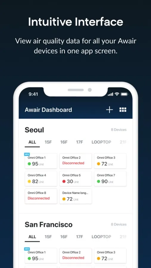 The AWAIR Business app works alongside AWAIR Omni air quality monitor and the AWAIR Dashboard platform to provide you with real-time insight into the health and safety of your building. Use this app to streamline device setup and manage your devices from anywhere.