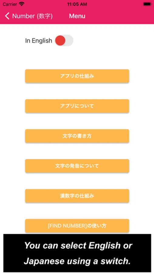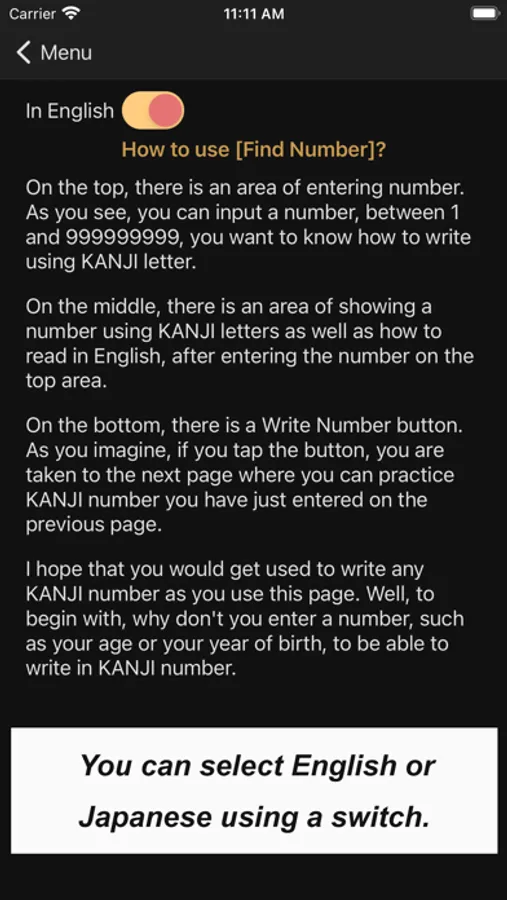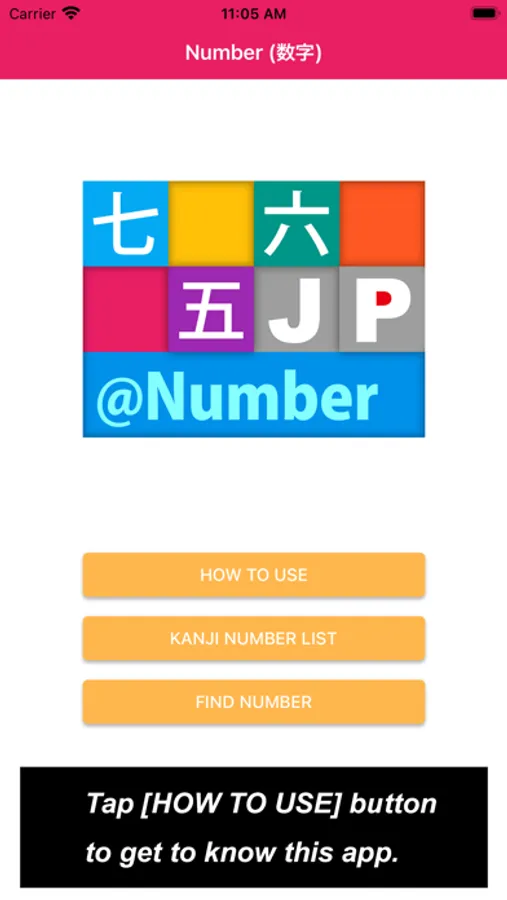 In the "How to use" section, the first thing to be seen when you tap [How to use] button is a list of buttons to explain the app, such as [How to draw Kanji letter?], [How to pronounce Kanji letter?], [How to build Kanji number?], [How to use FIND NUMBER button] etc.