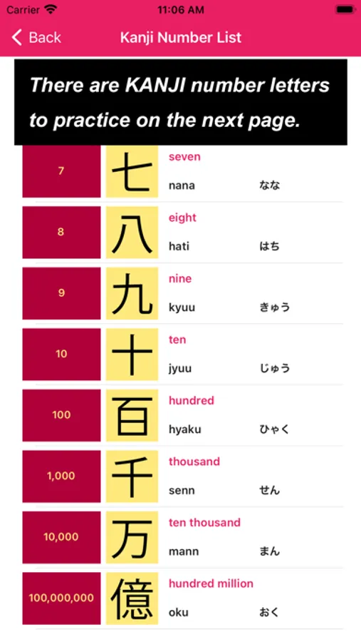 In the "Kanji number List" section, the first thing to be seen when you tap [Kanji number List] button is a list page where you can choose "Kanji number letter". Each cell of the list is composed of Five sections, such as "number", "image of Kanji number", "its number in English", "its number in Japanese" and "its number in Hiragana". The second thing to be seen when you tap one of these letter is a practice page of "Kanji letter". The third thing to be seen when you tap [Test my Kanji] button is a test your Kanji page where you can write letter without any hints. If you were comfortable with its Kanji letter, you might tap [Kanji word list] button to choose other numbers related to its Kanji letter. The last thing to be seen when you tap one of these cell is a practice page of Kanji number that is composed of more than two Kanji letters.