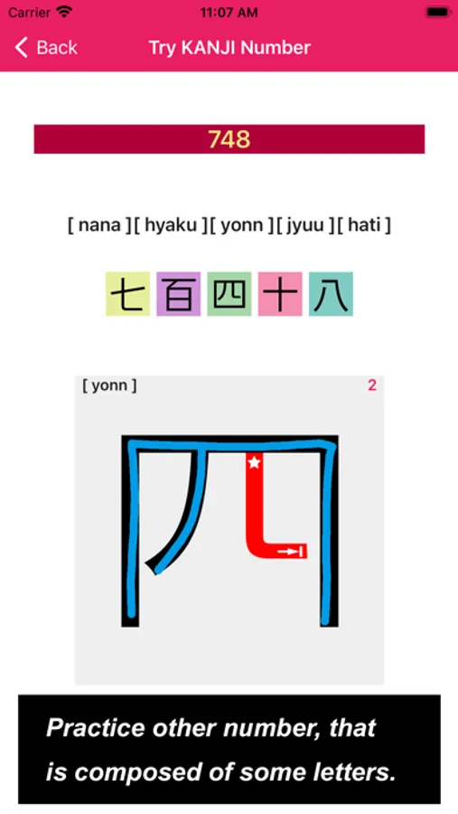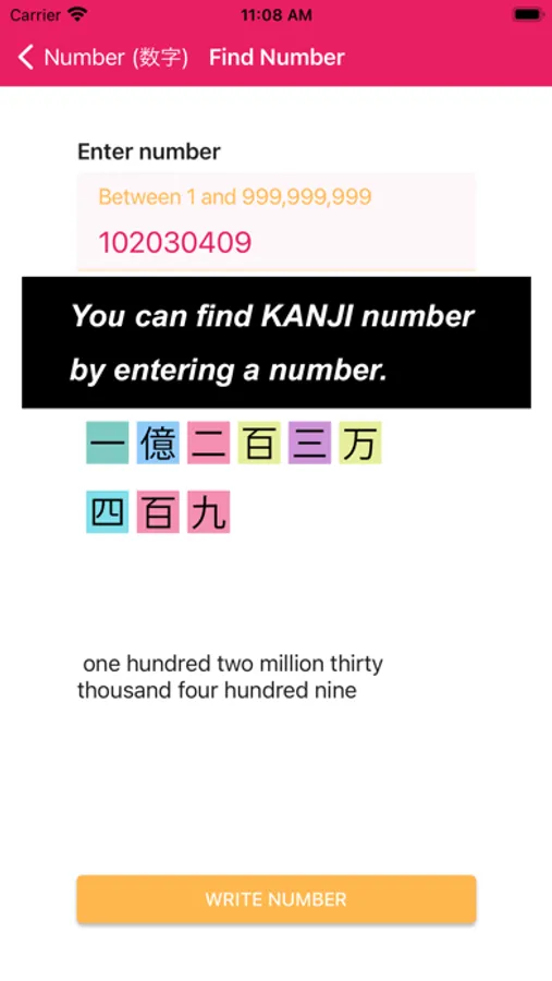 On the top, there is an area of entering number. As you see, you can input a number, between 1 and 999999999, you want to know how to write using KANJI letter. On the middle, there is an area of showing a number using KANJI letters as well as how to read in English, after entering the number on the top area. On the bottom, there is a Write Number button. As you imagine, if you tap the button, you are taken to the next page where you can practice KANJI number you have just entered on the previous page. I hope that you would get used to write any KANJI number as you use this page. Well, to begin with, why don't you enter a number, such as your age or your year of birth, to be able to write in KANJI number.