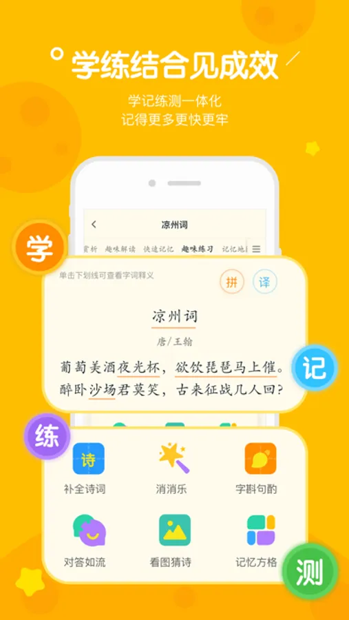 1. 诗词赏析:每首诗配备释义、注释、拼音、朗诵、赏析等,帮助学生快速理解诗词;