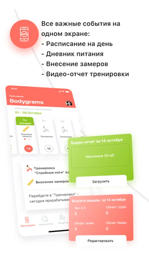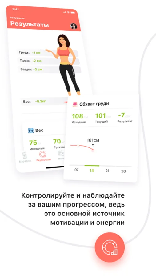 Изменения, которые видно - BodyGrams считывает и показывает все твои успехи - в сантиметрах, калориях и килограммах.