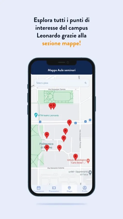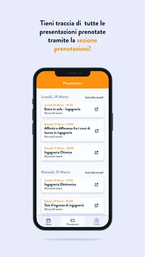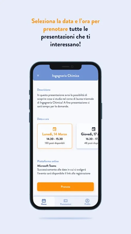 Tramite l'app potrai gestire le tue prenotazioni e avere tutte le informazioni per partecipare alle presentazioni online e in presenza.