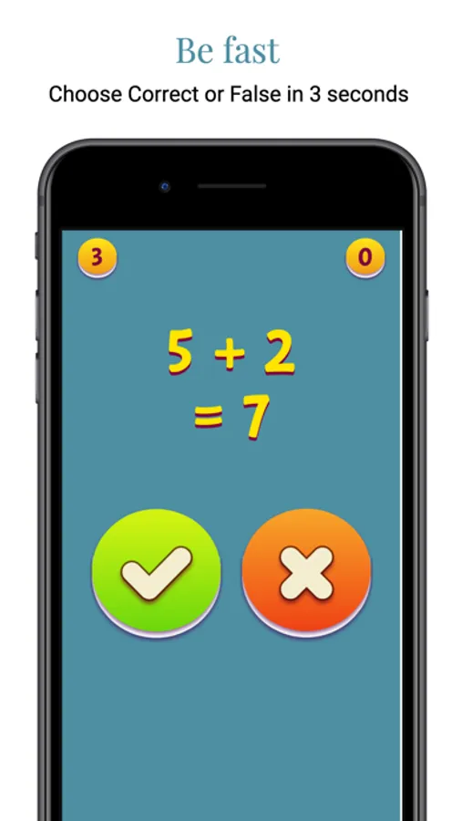 A simple mathematical calculation game that helps you to test and develop skills required to quickly solve examples in mind. There is no level in the math game. You have to calculate two given numbers and decide if the answer is correct or wrong. Three seconds is given for every question. Every time three seconds is over or you clicked on the wrong button, the game ends. After answering thirty questions, two seconds is given for every question, and after answering sixty questions, one second is given for every question.