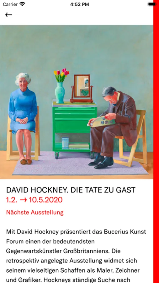 The BKF Guide is the ideal companion for your visit to the Bucerius Kunst Forum. You can either download the free app on your smartphone or borrow a handheld device at the museum for 2 euros. The guide navigates you through the exhibition using audio tracks, offering you more in-depth information on some of the artworks. In addition to the audio tour, the BKF Guide also includes video content and biographies of artists featured in the exhibition as well as service tips for your visit and information on museum events.