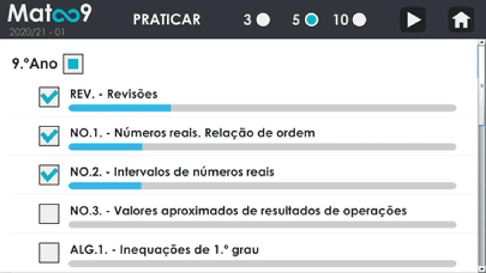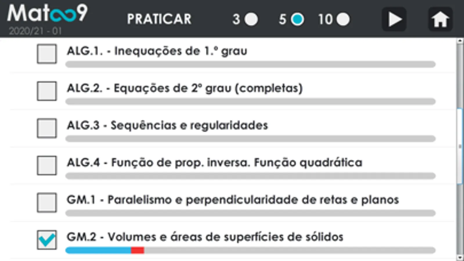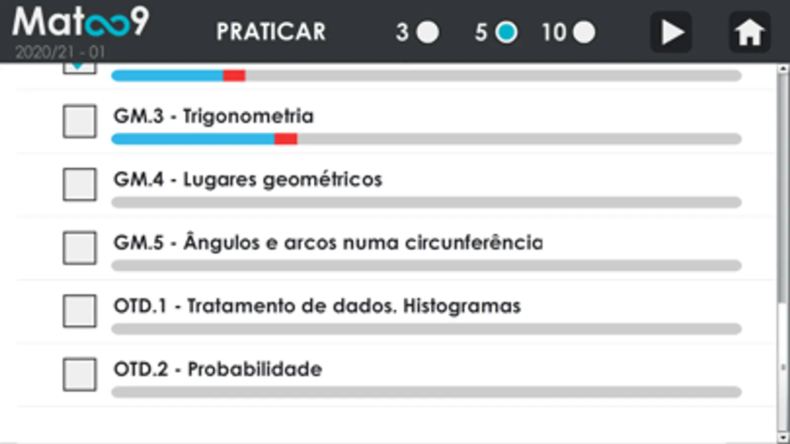 Na secção do PRATICAR, poderás treinar a resolução de mais de 500 exercícios de Matemática (estilo exame), organizados pelos seguintes temas: