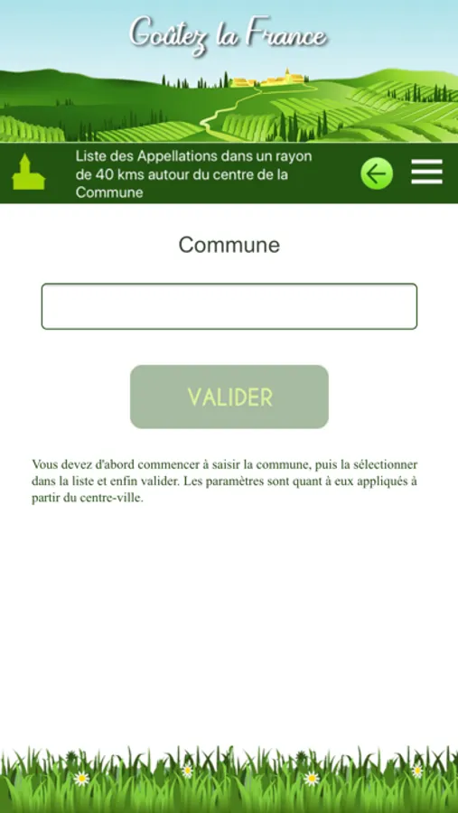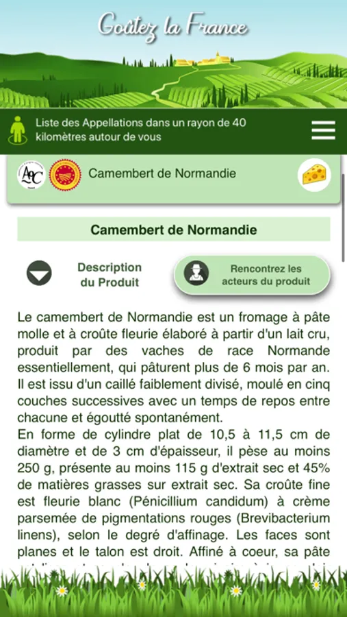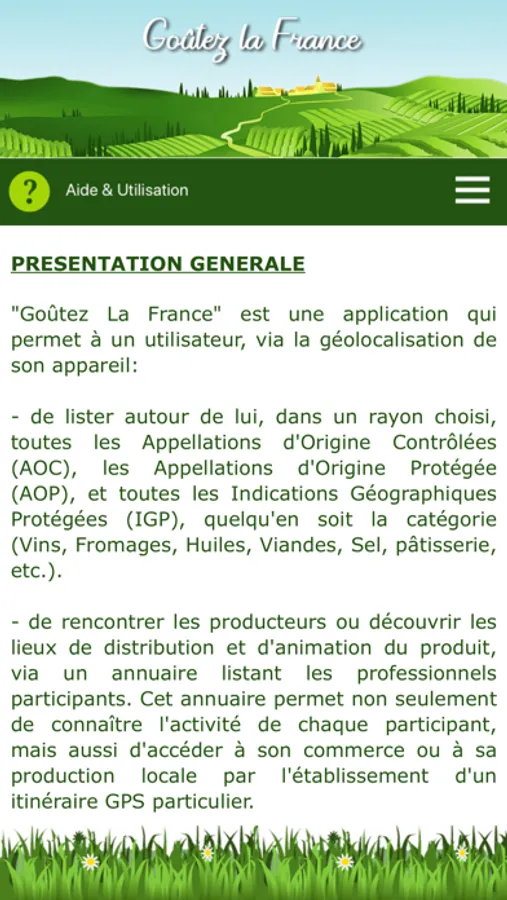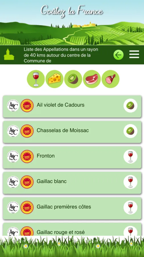 - de lister autour de lui, dans un rayon choisi, toutes les Appellations d'Origine Contrôlées (AOC), les Appellations d'Origine Protégée (AOP), et toutes les Indications Géographiques Protégées (IGP), quelqu'en soit la catégorie (Vins, Fromages, Huiles, Viandes, Sel, pâtisserie, etc.).