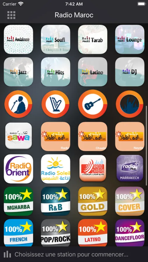 The Radios Stations: - Medi 1 - 2M - Aswat - Maroc Music - Atlantic - Hit Radio - Med Radio - Radio Mohamed 6 - Radio Mars - Cap Radio - Chada FM - Medina FM - Mgharba - Chaine Inter - Dancefloor - luxe radio - Cap Radio - Casa FM - 100% French - Yabiladi - SNRT Amazigh - Radio Orient - coran - SNRT - acoustic - nayda - yasser - doussari - sudaiss - hicham el hazar- soufi - el ghamidi - chaaraoui - fares abad - el kazabri