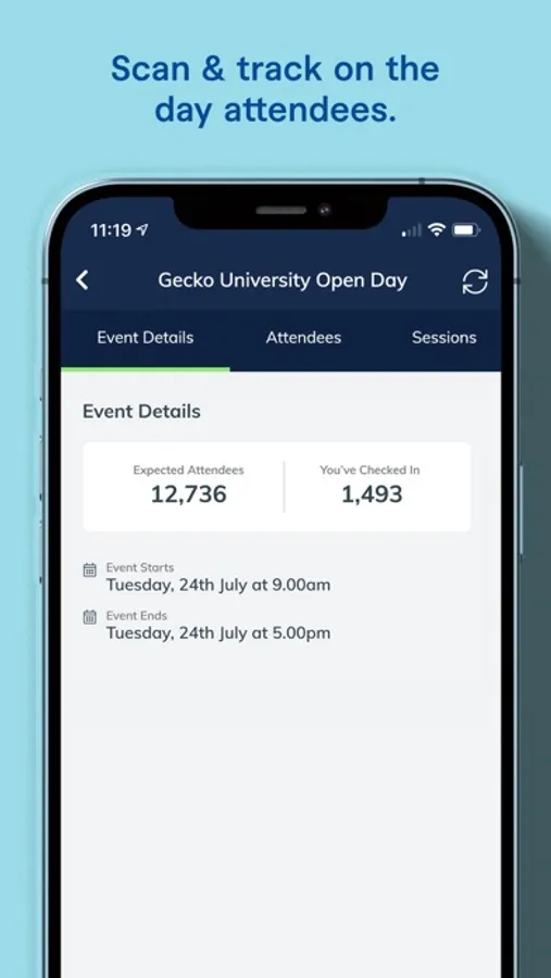 The app allows you to keep track of attendees on the move by scanning tickets of attendees, registering brand new attendees, as well as managing specific sessions and session times.