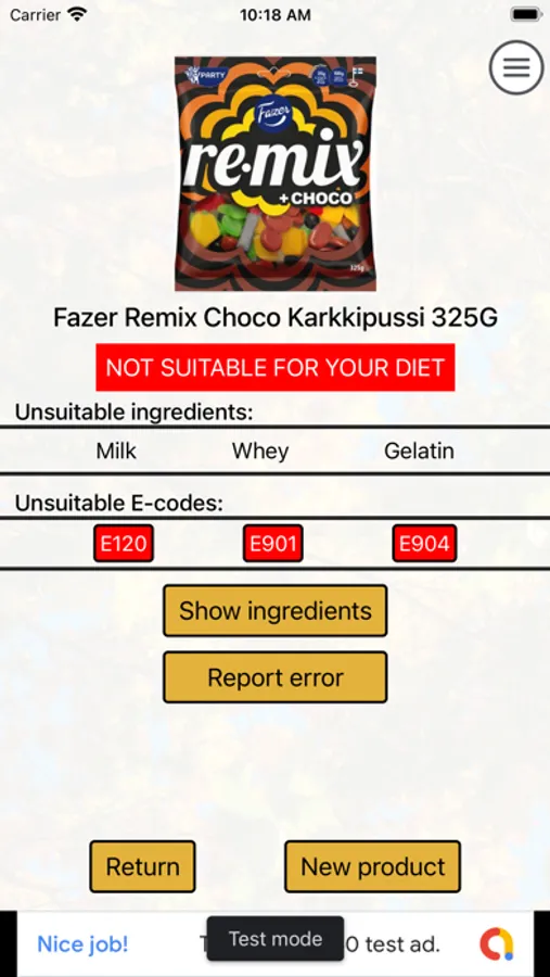 Scan product suitability; Vegan, Lacto-vegetarion, Ovo-vegetarian, Palm oil, Gluten!