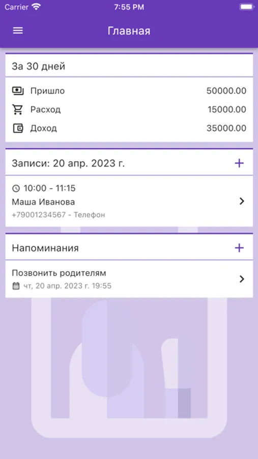 Помогает вести учет доходов и расходов, видеть финансовые итоги работы за день, месяц, год.