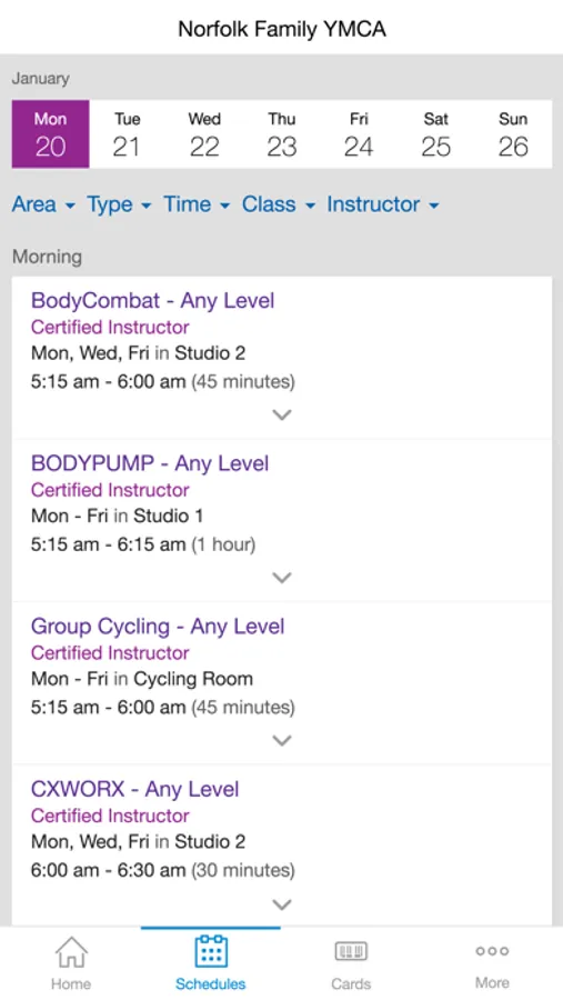 • Easily view schedules for each day and filter for the types of classes that you like.