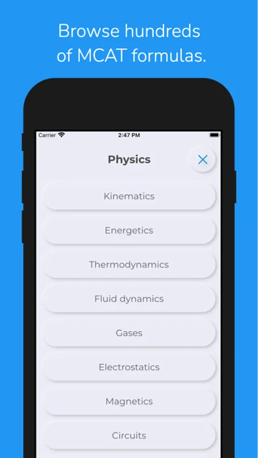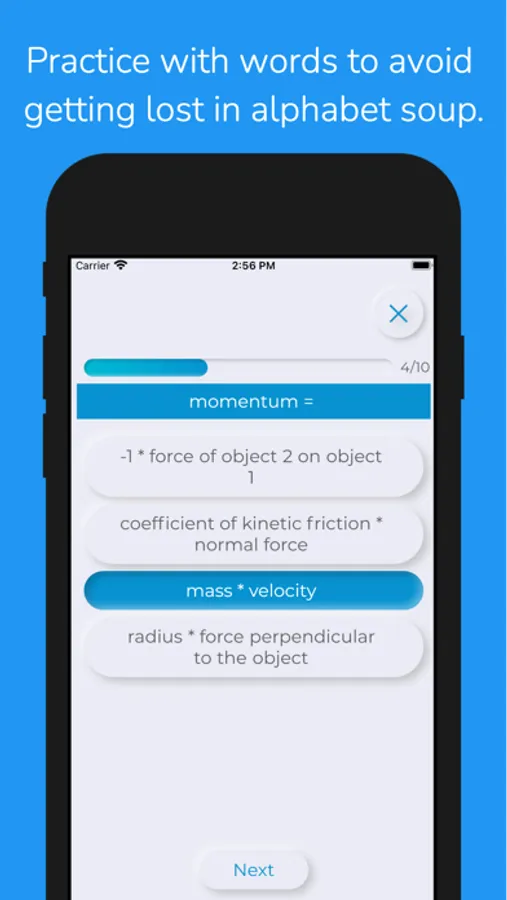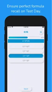 3) Learn Formulas: A Duolingo-style interface to memorize MCAT-relevant formulas. Practice variables, words, multiple-choice, or fill-in-the-blank, and ensure you don't misremember any formulas on Test Day.