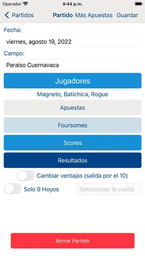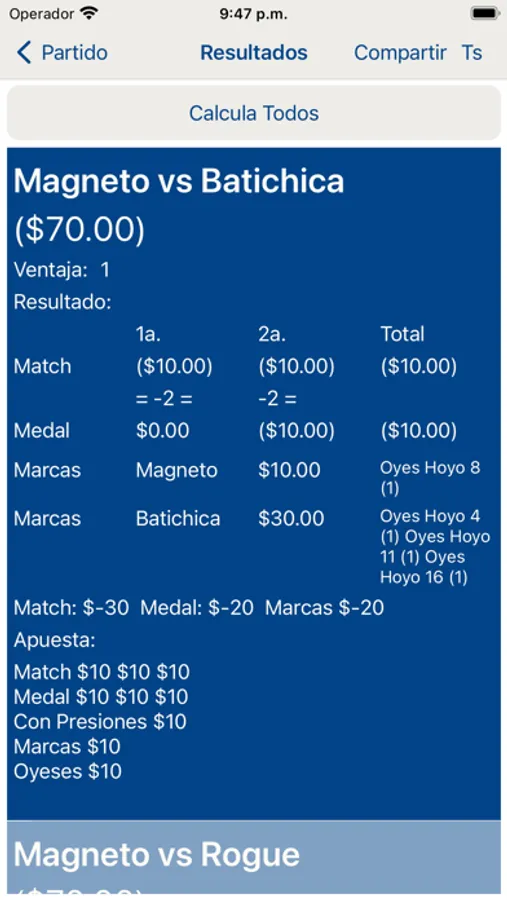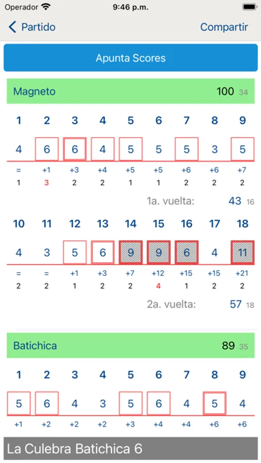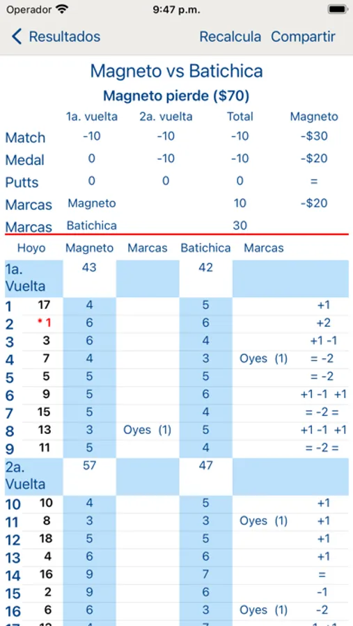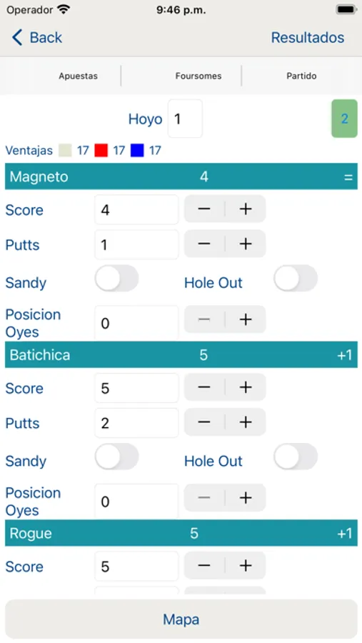 Registra los scores de todos hoyo por hoyo y al terminar calcula todos los resultados.