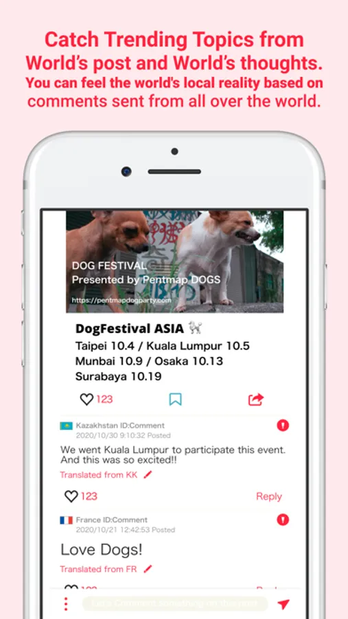 You can post text, photos, videos, and URL links, also you can comment to these topics. And text data which you posted will be translated to 40 languages automatically.