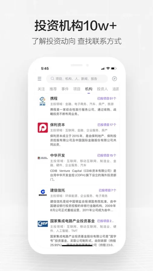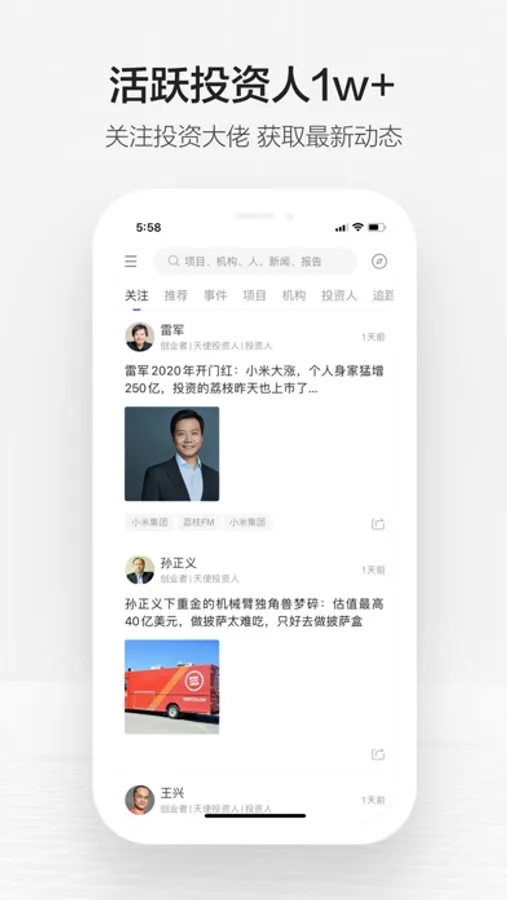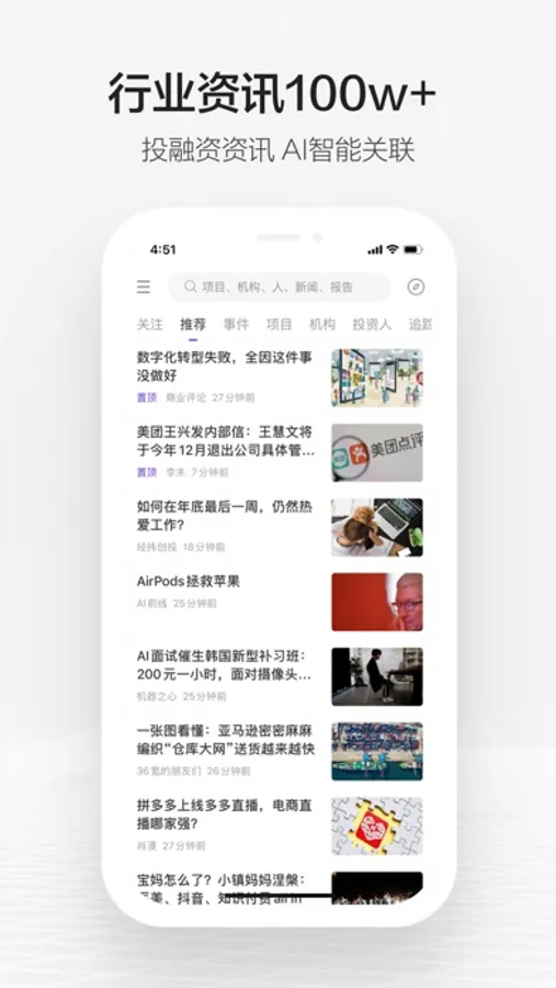 2、资讯:实时更新创投行资讯,准确关联项目、机构、人物,并为每位用户个性化推荐内容;