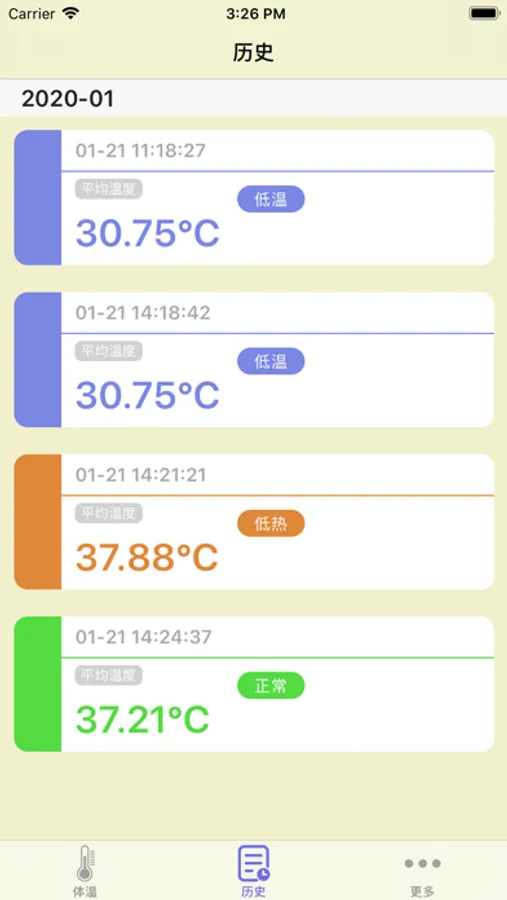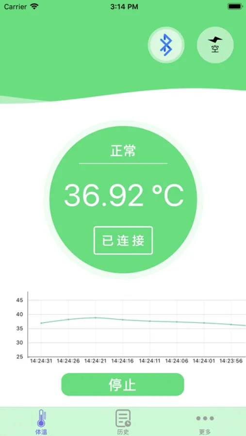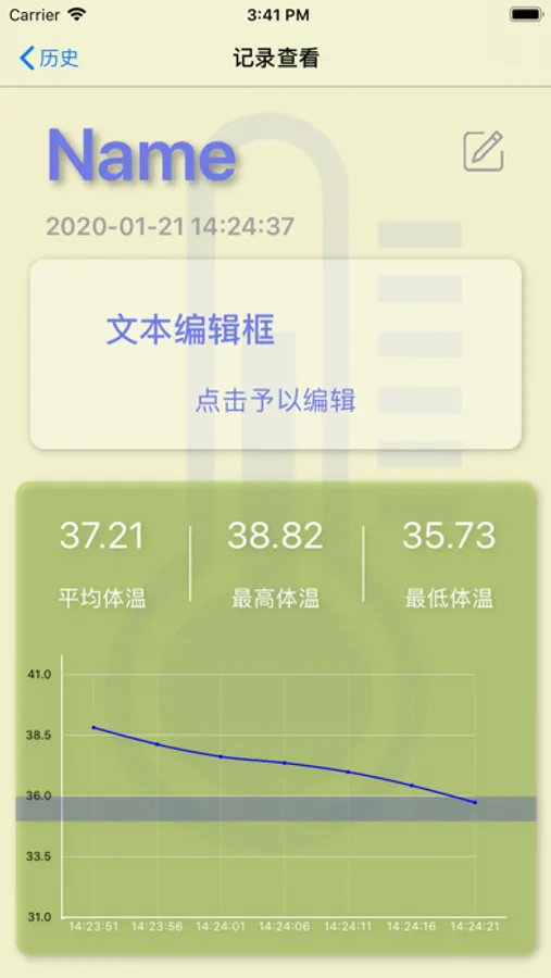 通过连接蓝牙外设获取实时的体温数据,并将其显示在App内通过数字与曲线走势了解体温变化,历史功能展示出了所有保存的体温数据,通过主题颜色一幕了然的让用户知道体温的状况,记录查看功能让用户对监控的数据进行详细查看了解异常体温的发生时间。