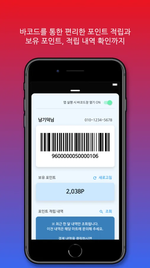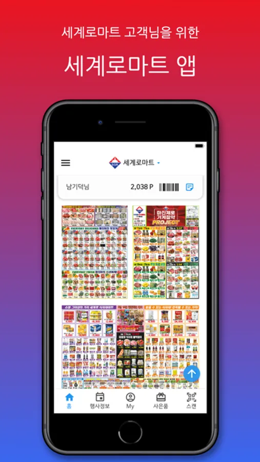- 세계로마트 앱에 탑재된 회원 바코드를 통해 더 편리하게 포인트를 적립하세요.